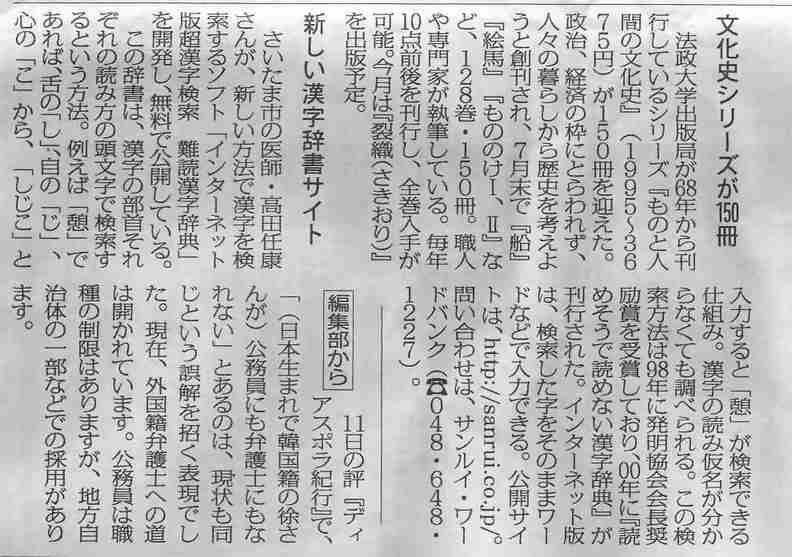 超漢字検索難読漢字辞典が毎日新聞で紹介されました。