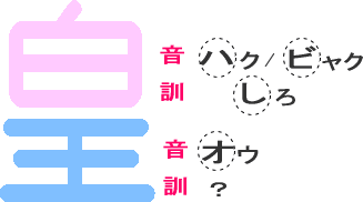 皇 しおき (しろ+オウ+きみ) 「冠」+「脚の音」+「脚の訓」 |